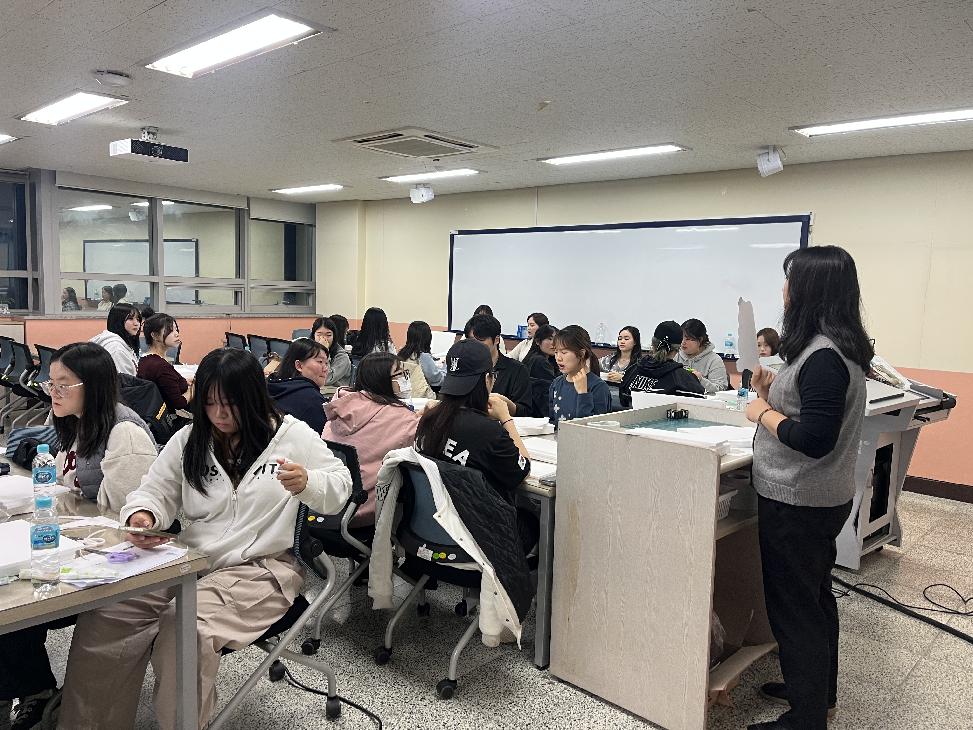 아동학과에서는 2025학년도 현장 실무 대비 공예 특강을 진행하였습니다. 이번 특강은 보육현장에서 필요한 공예 역량을 강화하고, 다양한 재료와 도구의 활용 능력을 기르기 위해 마련되었습니다. 특강은 총 2팀으로 나누어 진행되었으며, A팀은 펠트공예를 주제로 펠트의 사용법을 익히고 기본 바느질법과 도구, 부재료 사용법을 배우며 환경 게시판 꾸미기 활동을 진행하였습니다. B팀은 폼아트공예를 주제로 폼아트의 기본 이해와 재료의 성질을 익히고, 기본도구와 재료 사용법을 학습한 뒤 환경 게시판 꾸미기 활동을 체험하였습니다. 참여한 학생들은 직접 공예 활동을 경험하며 현장에서의 적용 방법과 교육적 활용 방안에 대해 생각해볼 수 있는 의미 있는 시간을 가졌습니다. 앞으로도 예비 보육교사들의 전문성 향상을 위한 다양한 실무 중심 특강이 지속적으로 마련될 예정입니다.